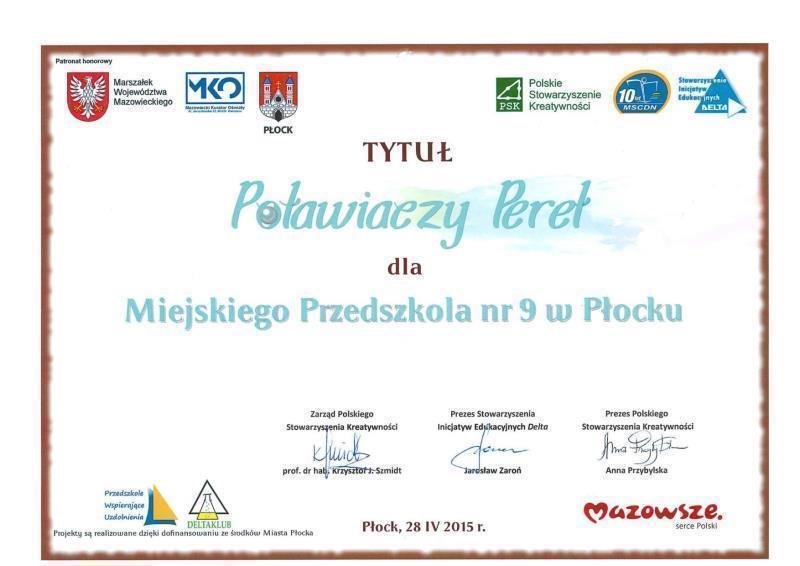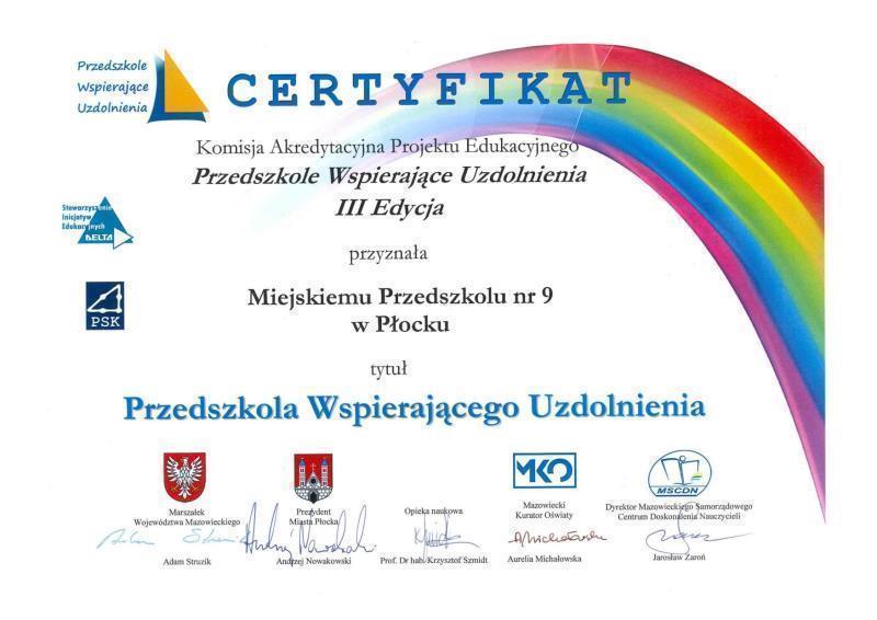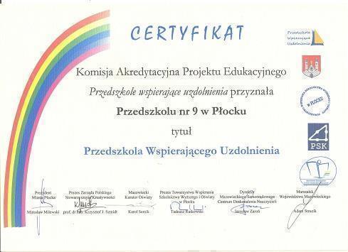 - Certyfikat „Przedszkole wspierające uzdolnienia” Polskiego Towarzystwa Kreatywności