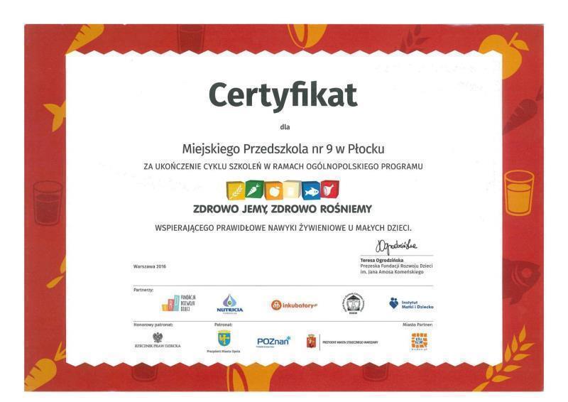- Certyfikat Akademii Zdrowego Przedszkolaka