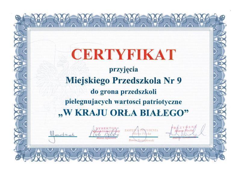 - Certyfikat przyjęcia placówki do grona przedszkoli promujących wartości patriotyczne "W Kraju Orła Białego"