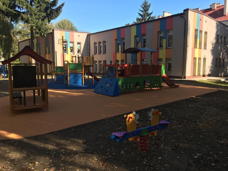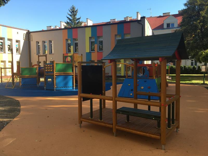 Plac zabaw z BEZPIECZNĄ ATESTOWANĄ nawierzchnią, podzielony jest na dwie części: jedna dla grup młodszych z poliuretanową powierzchnią, dużą ilością różnorodnych pomocy i zabawek adekwatnych do wieku rozwojowego dzieci, a druga dla dzieci starszych.