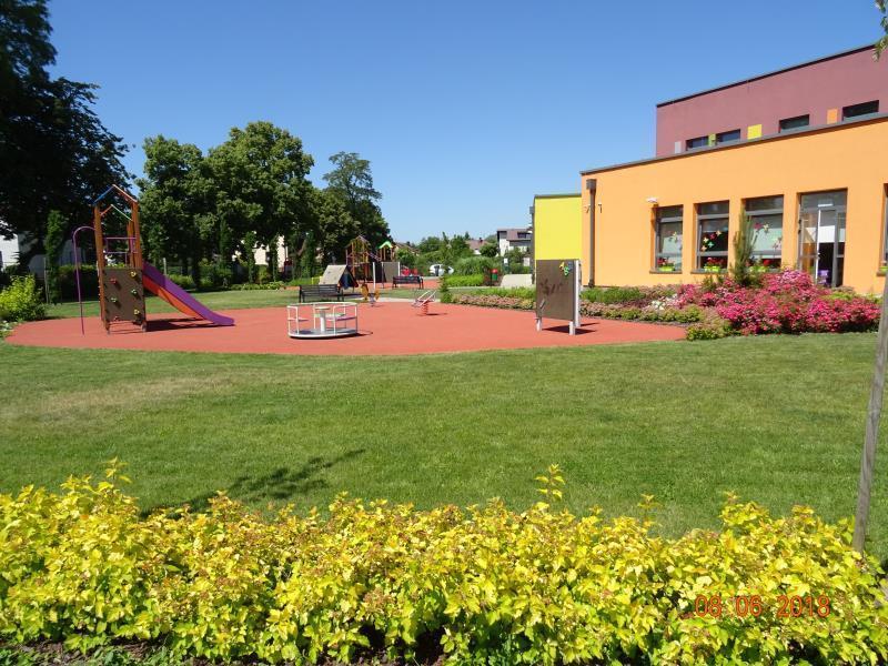 - ogrodem przedszkolnmy z różnorodną roślinnością.